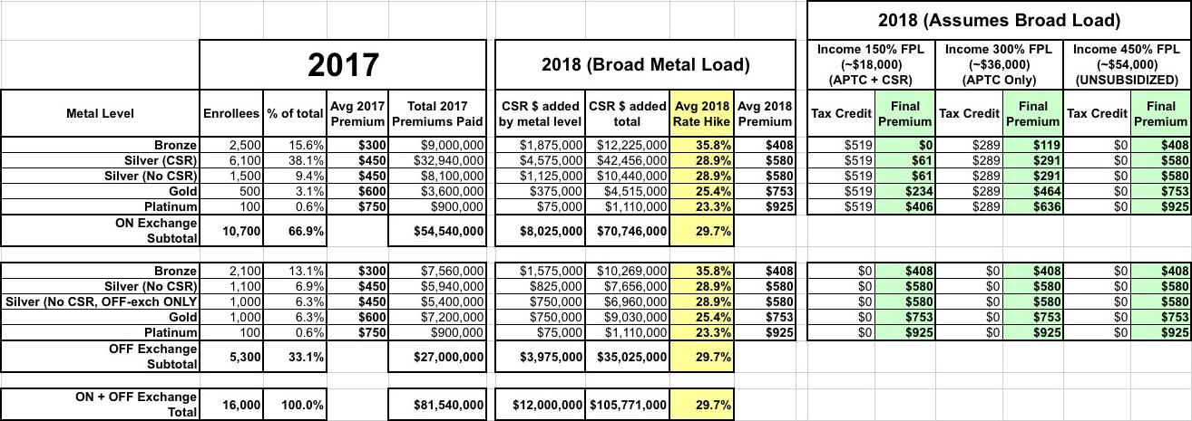 According to my data, on average nationally, unsubsidized 2018 individual market rates would have gone up around 15% assuming every carrier in every state assumed CSR payments would be made for 2018. That amounts to roughly $12.2 million in additional expenses total for all 16,000 enrollees as a whole (that is, around $93.8 million total in 2018 vs. $81.5 million in 2017).