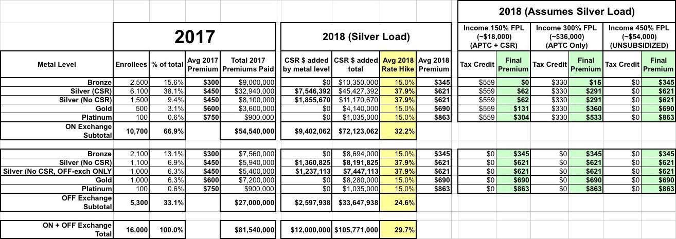 - All cases assume that the total 2018 Cost Sharing Reduction load is projected to be around $12,000,000 (around $1,900 per CSR enrollee on average, up from around $1,300 per enrollee this year)