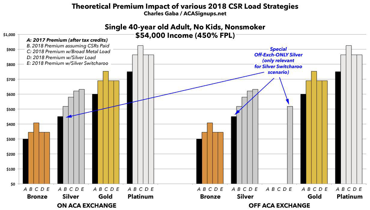 I've written a lot in recent weeks about the real world impact that Trump cutting off CSR reimbursement payments will have on 2018 premiums in various states depending on how they choose to load the additional cost. As I've noted repeatedly, there are basically four strategies they can take: They can assume the payments will continue; they can spread the load across all ACA-compliant policies; they can load all of the cost onto Silver plans only; or they can load all of the cost onto on-exchange Silver plans only, while also creating (if one doesn't exist) a special off-exchange-only Silver plan as a backstop for unsubsidized Silver enrollees (aka the "Silver Switcharoo").