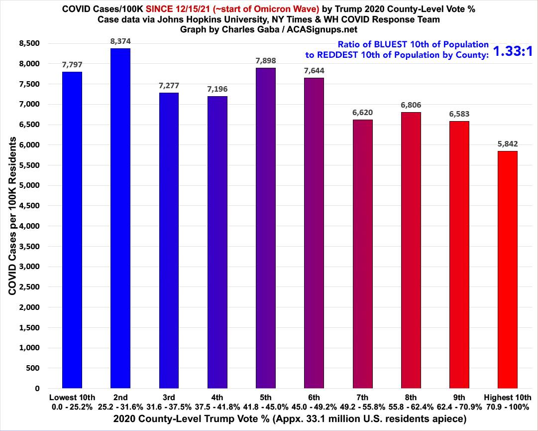 Death rates since Omicron started still swing red, as the death rate in the reddest decile is 1.74x higher than in the bluest. This is down from 2.9x higher three weeks earlier, however, and down from nearly 5.8x higher during the Delta wave. Remember, deaths tend to lag new cases by about 3 weeks, so it actually makes sense that the two would be shifting in opposite directions at the moment: