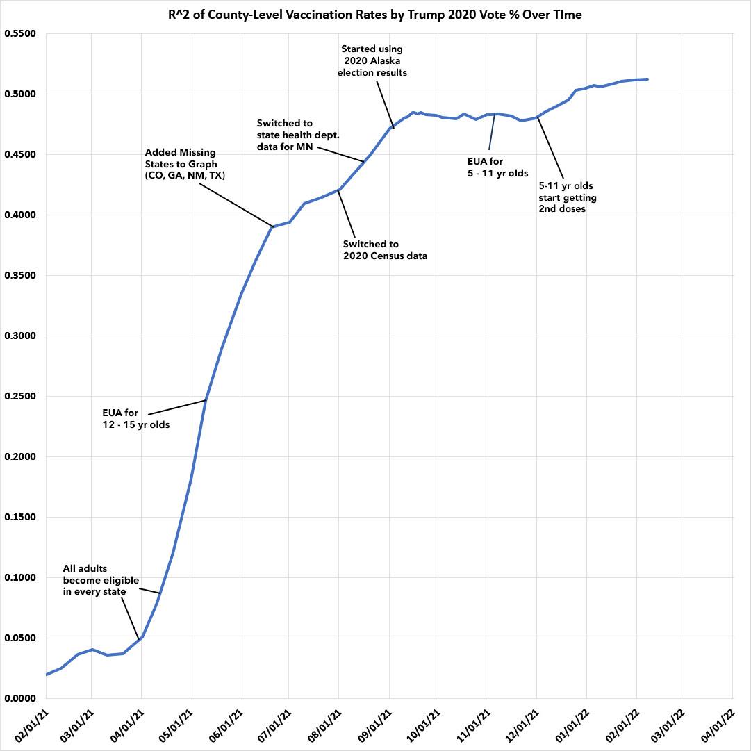 As I predicted back in mid-November, the most obvious reason for this is that 5 - 11 year-olds started receiving their 2nd Pfizer shot around Thanksgiving. The parents who were most likely to have gotten vaccinated themselves earlier this year are pretty clearly the ones most likely to get their children vaccinated, and the parents least likely to get vaccinated are, sadly, also those least likely to vaccinate their children either: