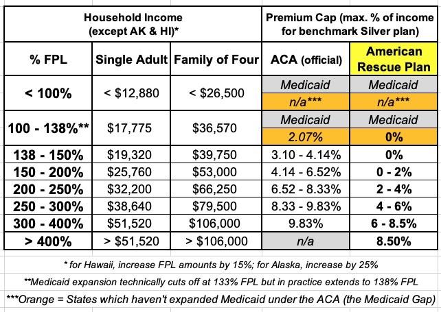 Prior to the American Rescue Plan, ACA subsidies were limited (on a sliding income scale) to enrollees earning between 100 - 400% FPL (up to around $51,000/year for one person, or $106,000/year for a family of four. If you earned more than 400% FPL, however, you had to pay full price no matter how expensive the premiums were.