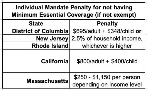 In CA, DC, NJ & RI, the penalty either identical or very close to the old federal penalty. Massachusetts uses their own formula. The financial penalty for not having coverage (assuming you don't qualify for an exemption) will be charged when residents file their 2022 state taxes in spring 2023.