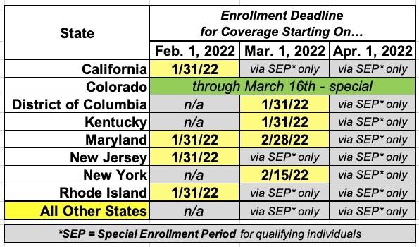 COLORADO is, as. noted, a special case. The final deadline is March 16th, but there's a few caveats: First, you have to have been "impacted by the COVID-19 pandemic (who hasn't been??) or the recent Colorado wildfires. Second, this is only open to those currently uninsured. See here for details.