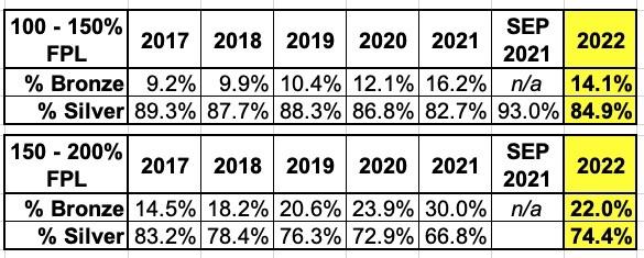 This makes absolutely zero logical sense. While there are always exceptions (i.e., in some cases the enrollee may need a particular healthcare provider or prescription drug which isn't part of any of the networks/formularies included in any of the Silver plans available in their area), there's almost no reason why anyone earning less than 200% of the Federal Poverty Level (FPL) should have enrolled in anything other than a Silver plan this year...and especially if their income was less than 150% FPL.