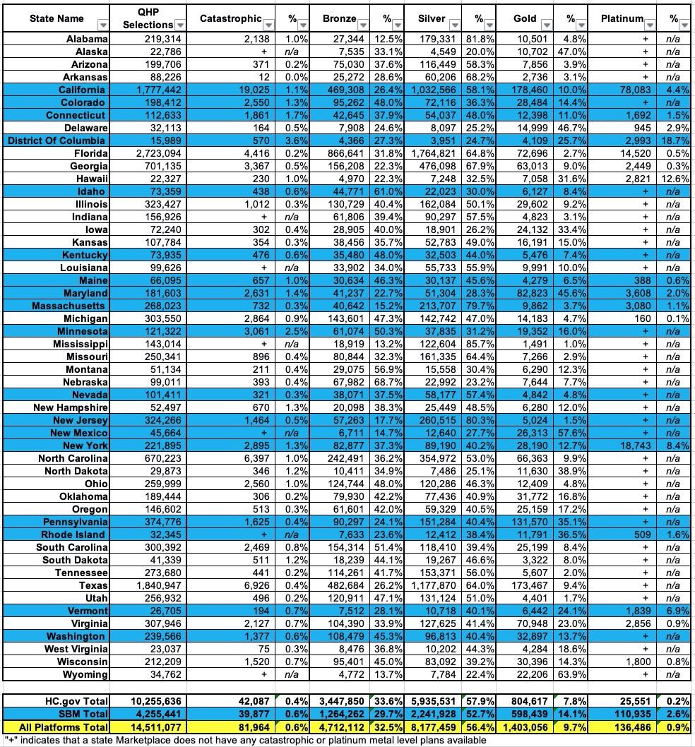It's worth noting that less than 1% of all ACA enrollees choose Platinum plans (the official Platinum, that is; not the "Platinum-equivalent Silver" I mention above). In fact, Platinum plans aren't even available in most states.