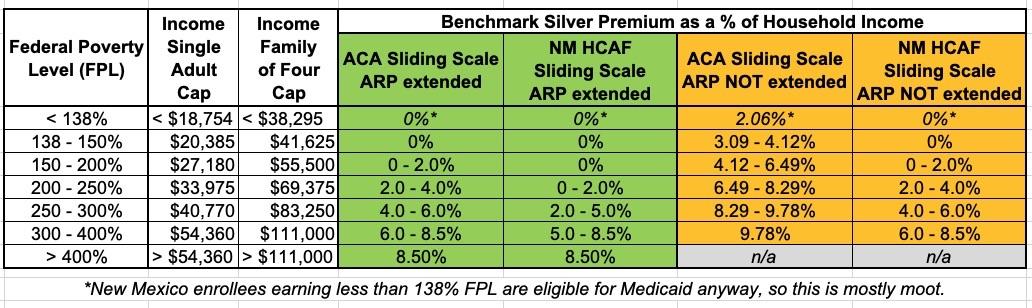 If the ARP subsidies are extended into 2023 or beyond, any New Mexico enrollee earning less than 200% FPL can get a Silver ACA healthcare policy for $0 in premiums. Those earning between 200 - 400% FPL would also see their premiums drop dramatically compared to the ARP subsidies...which are already dramatically lower than they are under the "official" ACA subsidy table.