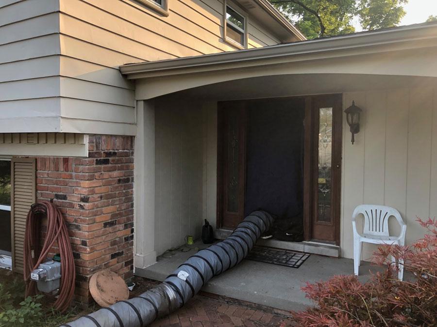 Next, they seal up the entire house except for cracking open one window upstairs to help draw the heat upwards. Then they seal up the front door with heavy tarps...and crank up the generator to blast piping hot air inside.