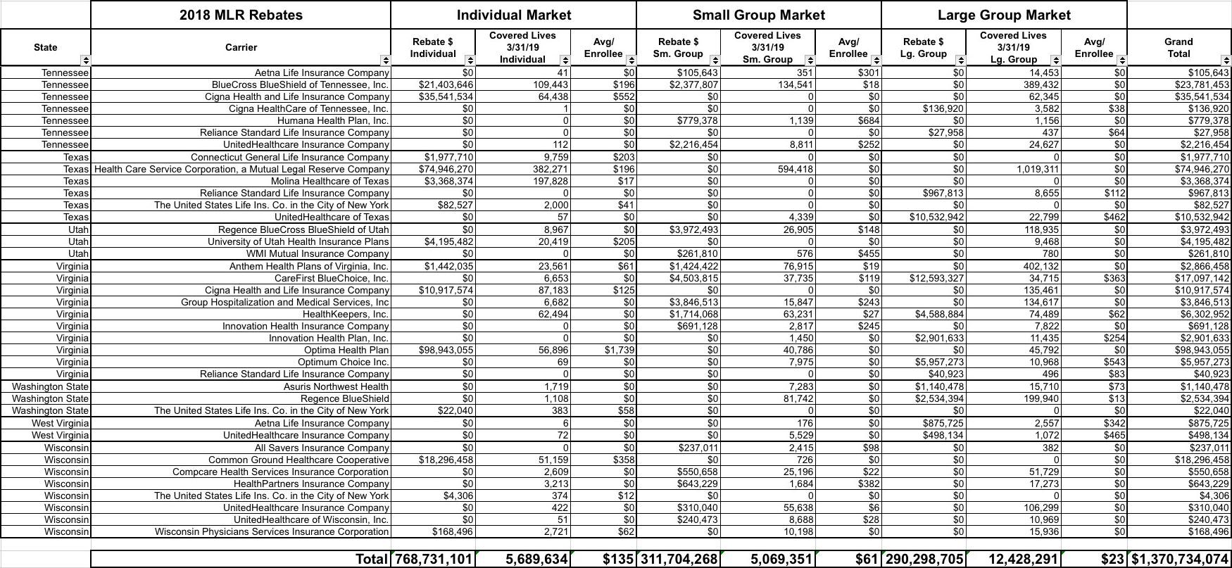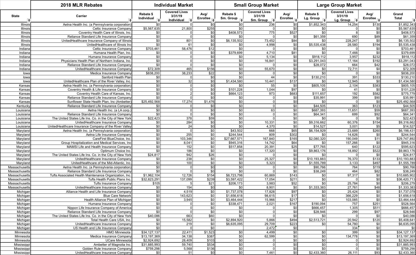 OK, OK, I know I said I was sick of writing about MLR rebates, but there's one more important point I need to mention...and while I'm at it, I also said "to hell with it" and recompiled the rebate tables for all 50 states into a single massive table listing every carrier offering rebates in every state.