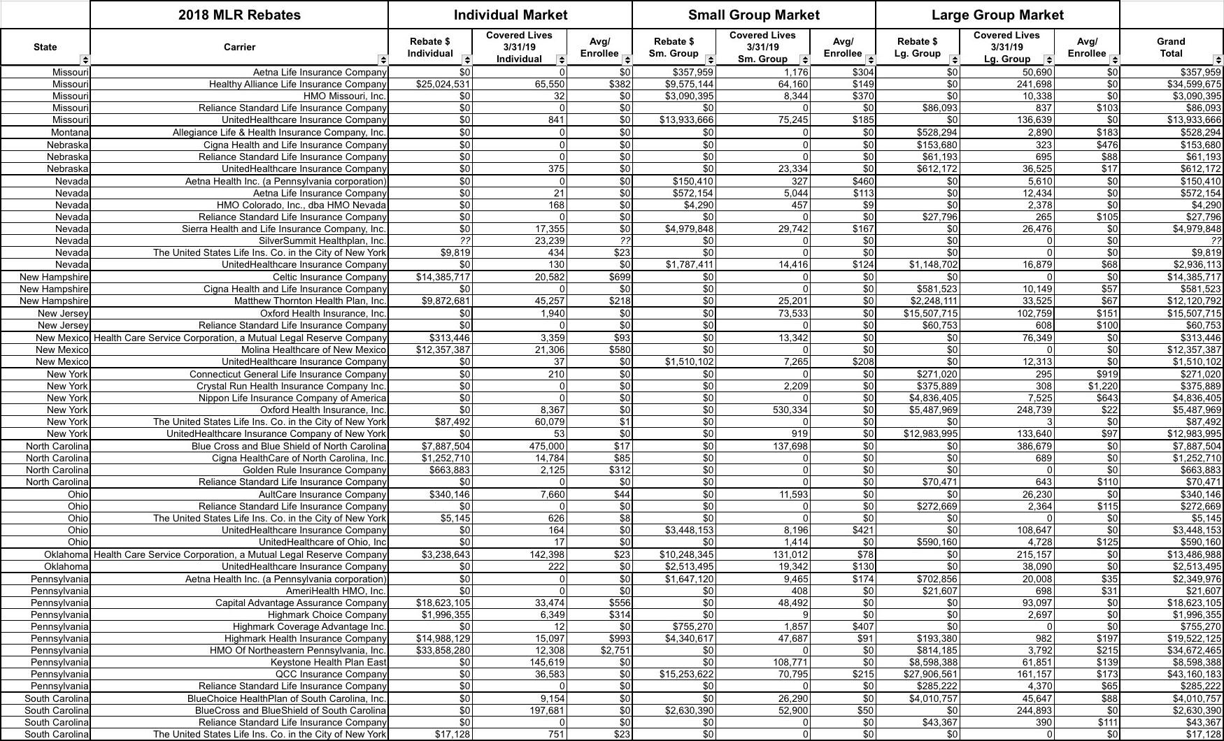 As for the state-by-state rebate table, see below...I've broken it into four image files. Click each one to load a higher-resolution version. Out of over 2,700 carriers nationally (carriers in multiple states count for each state, since that's how the MLR percentages are calculated), only 207 are actually subject to MLR rebates across any of the three markets this year, and of those, only 67 owe rebates on the individual market.