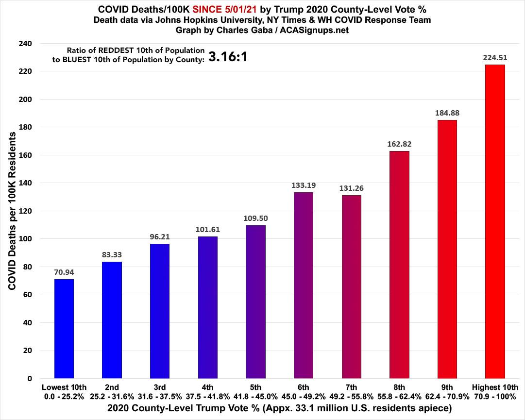 As always, what's even more disturbing is how closely the death rate by partisan lean matches the death rate by vaccination rate; they're almost mirror images of each other: The death rate since last May in the reddest tenth of the country is still nearly 3.2x higer than in the bluest tenth: