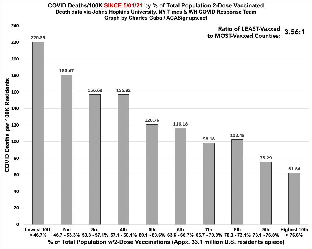 There's still a clear and dramatic correlation between how much of the population has been 2-dose vaccinated and its COVID death rate since last May. The least-vaccinated decile has a death rate ~3.6x higher than the most-vaccinated decile. It's important to note that this jumps around a bit from month to month since a few counties move from one decile bracket to the other as vaccination data is bulk-updated: