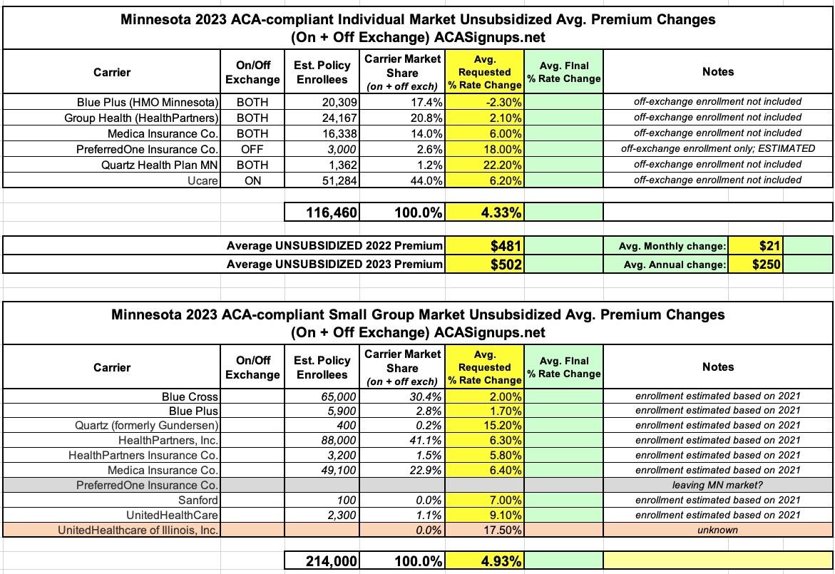 Minnesota: (Preliminary) avg. unsubsidized 2023 #ACA rate changes: +4.3%