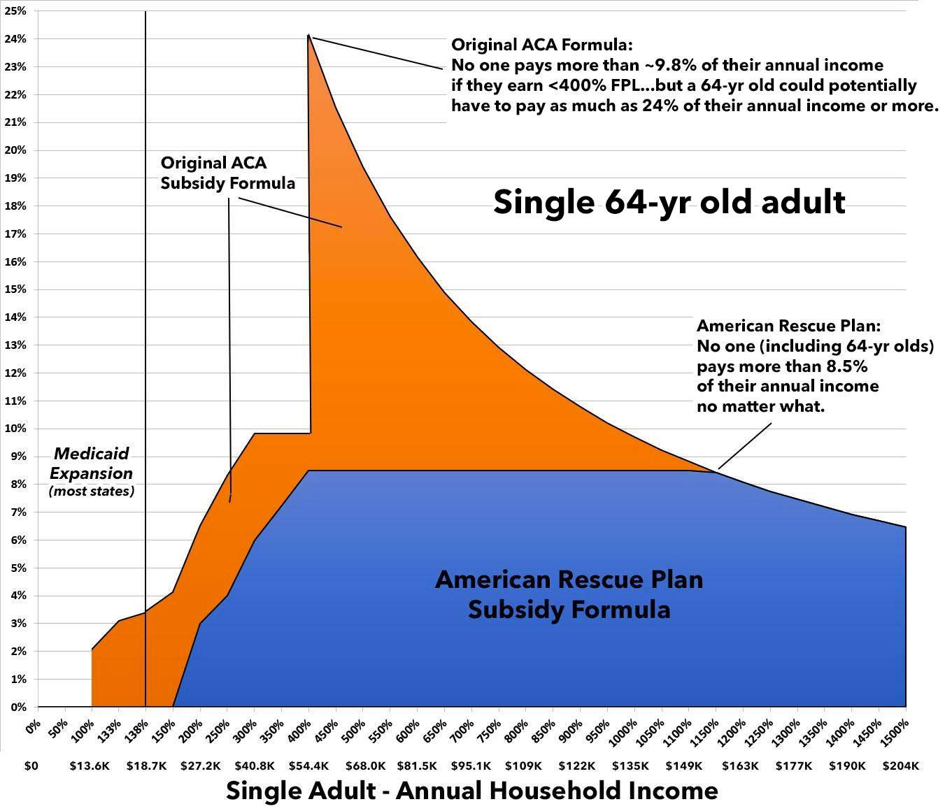 To demonstrate how ACA premium subsidies work under both the original ACA formula and the American Rescue Plan's enhancements, here once again is my world famous (?) Subsidy Cliff graph.