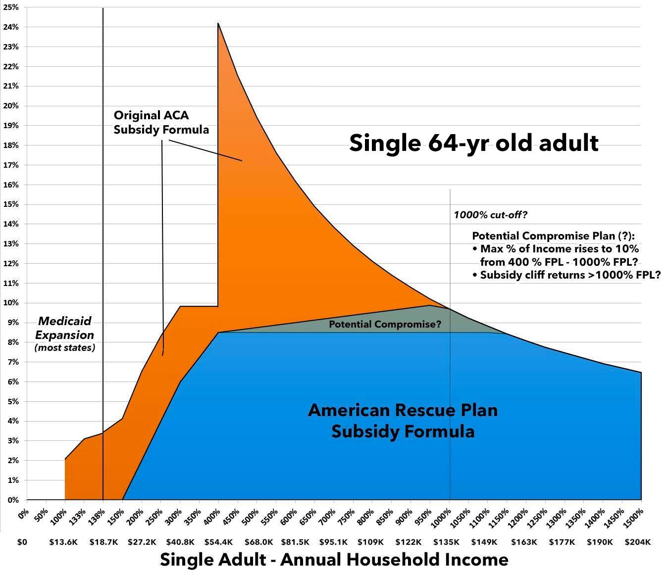 Note that for this particular individual, the subsidies would taper off at around 1000% FPL (~$136K) under both the ARP and the theoretical compromise scenario anyway (it'd actually be more like 1150% FPL under the ARP...~$156K). There are cases where even a 1000% FPL cut-off would still mean a significant price hike, to be sure (for reference, that's $278K for a family of four).