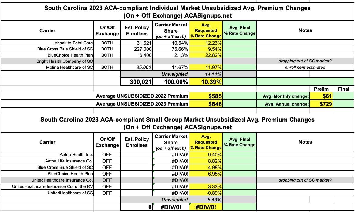 South Carolina: (Preliminary) avg. unsubsidized 2023 #ACA rate changes: +10.4%