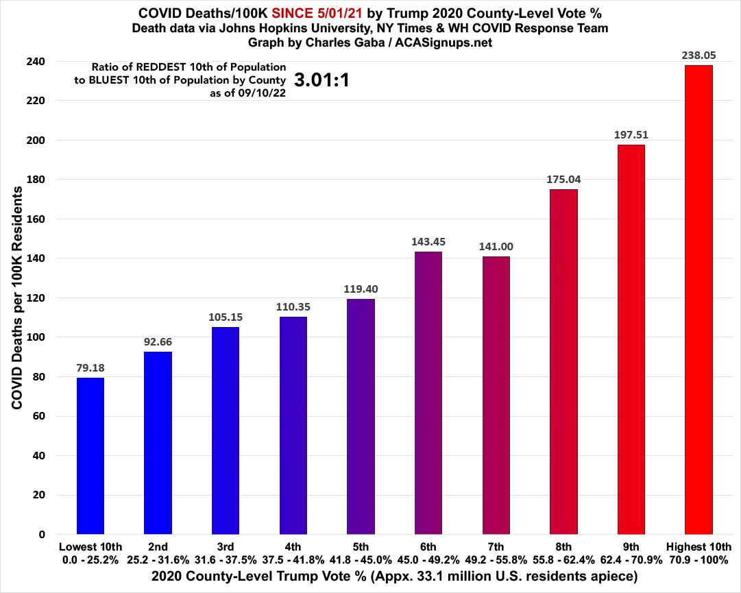 As I noted, the death rate since May 1, 2021 (the point when all U.S. adults were eligible to get vaccinated against COVID) in the reddest tenth of the country is still over 3.0x higher than in the bluest tenth: