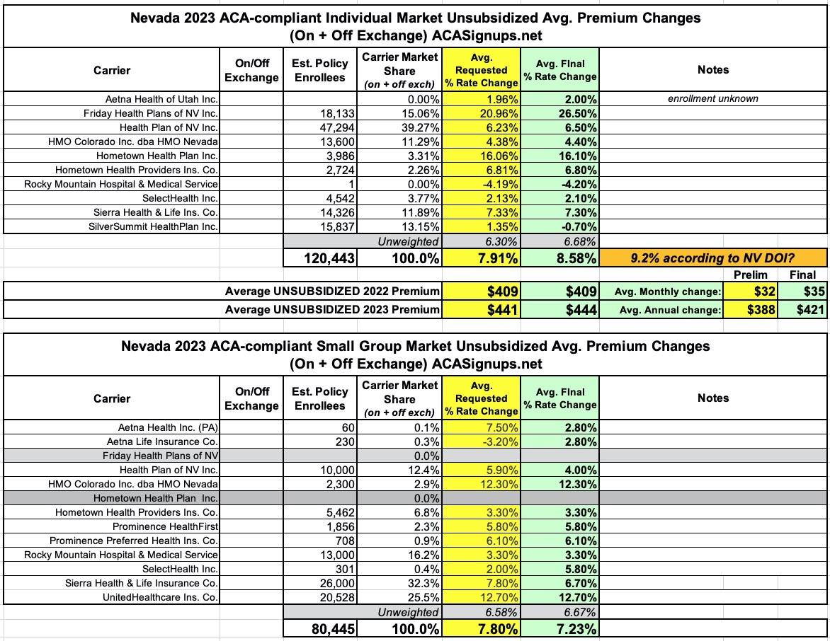 Nevada: Final avg. unsubsidized 2023 #ACA rates: +8.6%