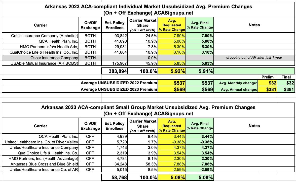 Arkansas: (updated) Final avg. unsubsidized 2023 #ACA rate changes: +5.9%