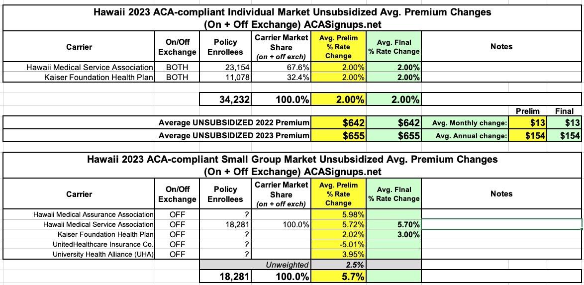 Hawaii: Final avg. unsubsidized 2023 #ACA premiums: +2% (updated)