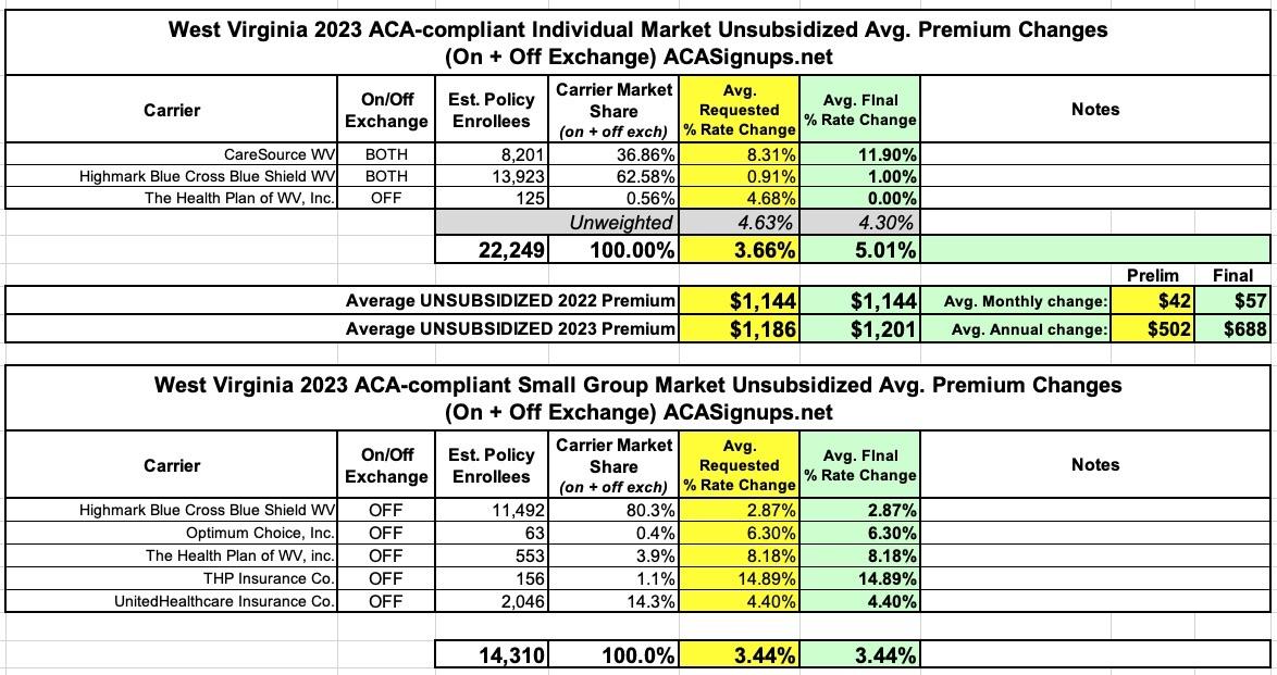 For 2023, they're looking at roughly a 5% rate hike for those who don't qualify for ACA subsidies. The good news is that, being West Virginia, the vast majority of those enrolled (95%) do qualify for financial help.