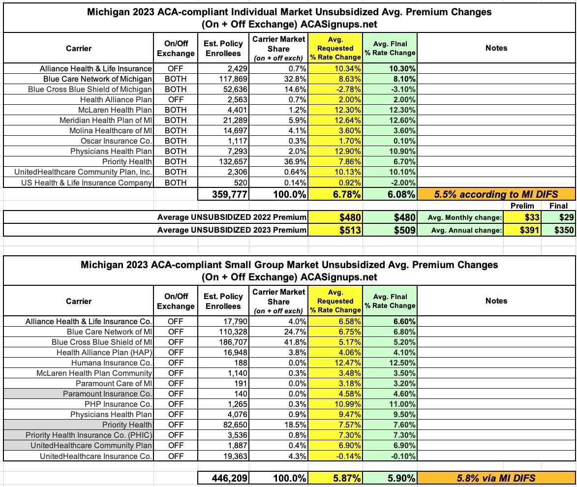 Michigan: Final Avg. Unsubsidized 2023 #ACA Rate Change: +5.5%