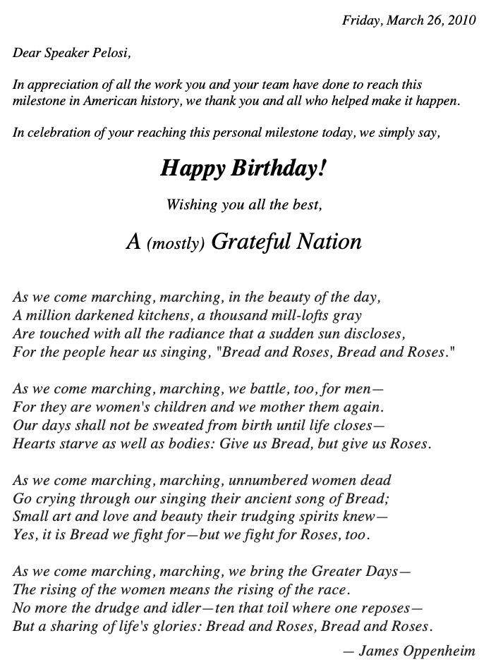 As a few of you may be aware, all this week I've been spearheading an effort to send Speaker Pelosi roses today, both to wish her a happy birthday as well as to thank her for her successful shepherding of the historic (if, admittedly, deeply flawed) health care reform bill through the House of Representatives.