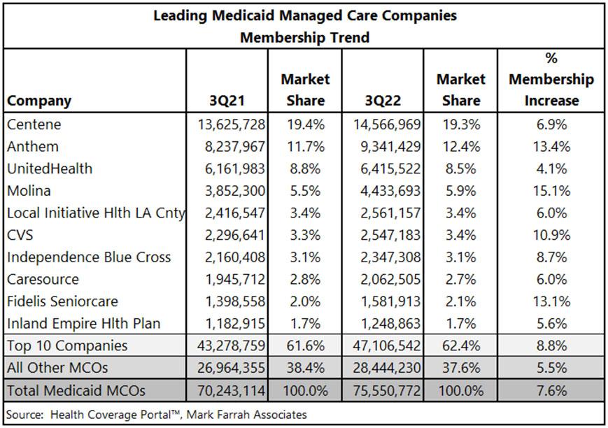 Molina reported the largest percentage increase in membership between 3Q21 and 3Q22, at 15.1%, with a gain of nearly 582,000 managed Medicaid members. Anthem, meanwhile, was one of few top companies to see an increase in market share (+0.7%) and experienced the largest membership increase, over 1.1 million enrollees, representing a 13.4% increase year-over-year. The table below shows that the top 10 companies, in September of 2022, all increased in Medicaid enrollment from the same period in 2021.