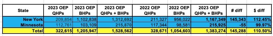 Finally, here's my projection of what the final 2023 OEP QHP numbers should look like, assuming the final week/2-week enrollment bumps are similar to what they looked like during the 2022 OEP for each state. Assuming an identical OEP wrap-up, the national QHP total should come in just shy of 16.4 million people: