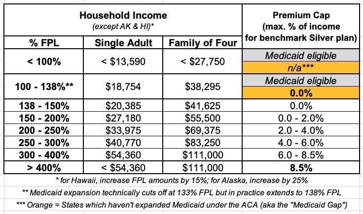 Before I get into this, it's important to understand what the Federal Poverty Line (or FPL) is. 100% FPL depends on how many people live in your household. For a single adult with no dependents, it's $13,590/year; for a family of four, it's $27,750/year. These amounts increase somewhat each year to account for inflation.