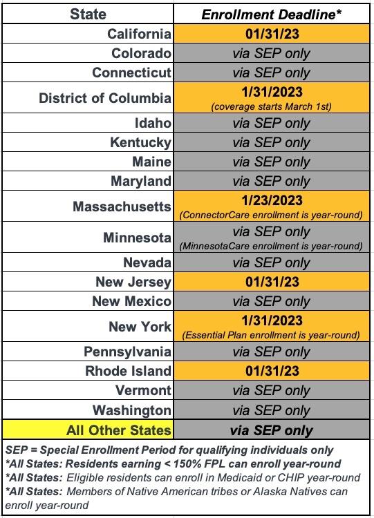 At the opposite end, most states had their final deadline on January 15th, but several states have later final deadlines. Here's a summary of the deadlines to sign up for 2023 ACA healthcare coverage, and when that coverage will start:
