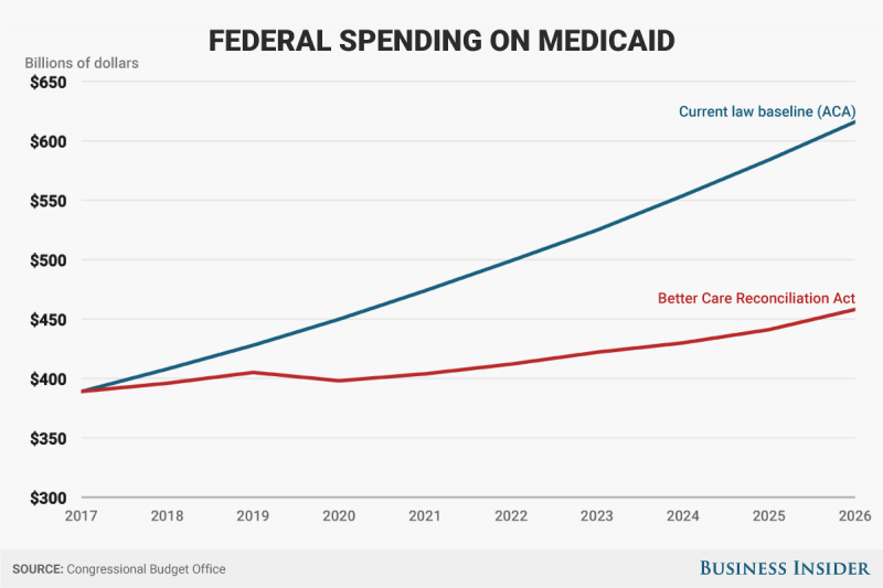 As this accurate chart from Business Insider shows how Medicaid spending is projected to look through 2026 under currentl law vs. under the BCRA: