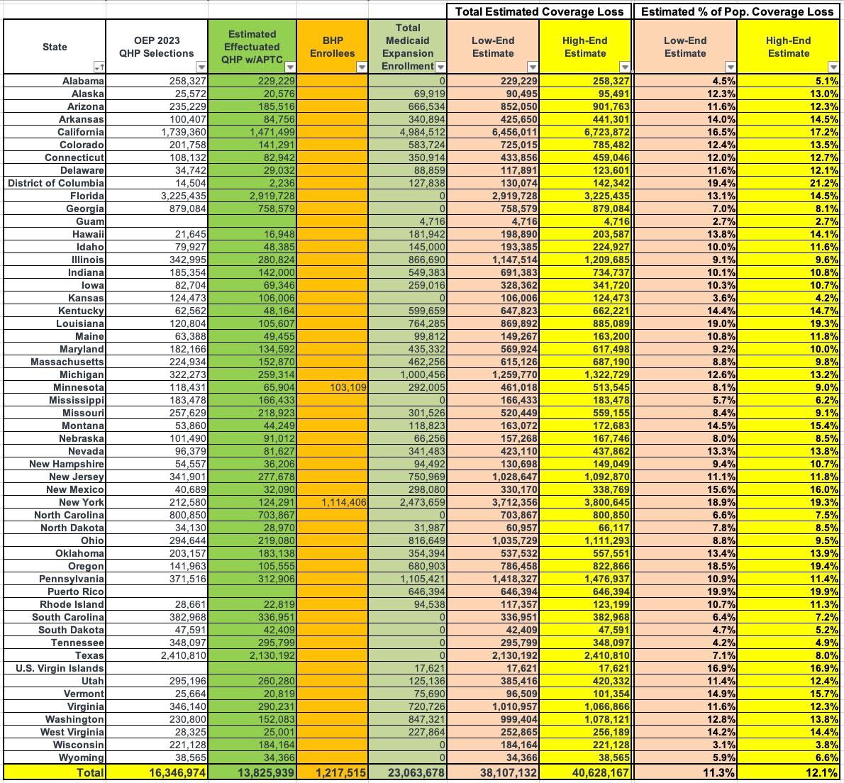 It's important to keep in mind that the numbers below are a bare minimum. They only include the number of people who would lose coverage due specifically to the elimination of ACA Medicaid expansion and APTC (this would also include elimination of the Basic Health Plan funding in Minnesota & New York, since that's also based on APTC funding). They don't include the potentially millions more who would likely lose coverage due to adding work requirement reporting for traditional Medicaid enrollees, eliminating the 50% minimum FMAP (Federal Medical Assistance Percentage) funding requirement for Medicaid budgets and so forth.