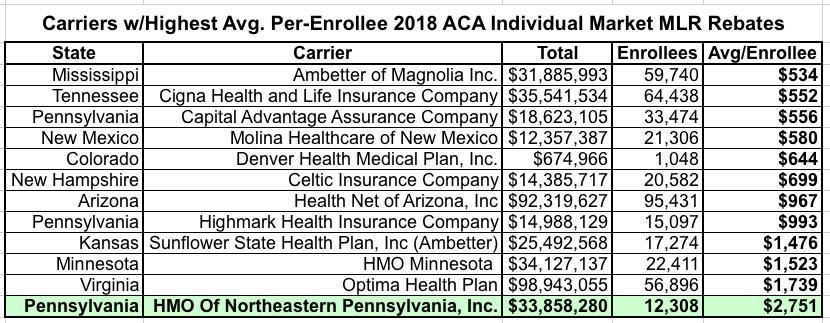 In fact, one carrier in particular, "HMO of Northeastern Pennsylvania, Inc." (operating as "First Priority Health HMO") had to pay an average of over $2,700 per enrollee to over 12,000 people: