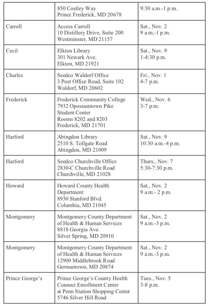 - To kick off open enrollment, nearly 20 statewide “Get Connected” events with experts providing free enrollment assistance and answering questions will be held around Nov. 1- 9. Visit the website for details or follow #GetConnected @MarylandConnect on Facebook, Twitter and Instagram.