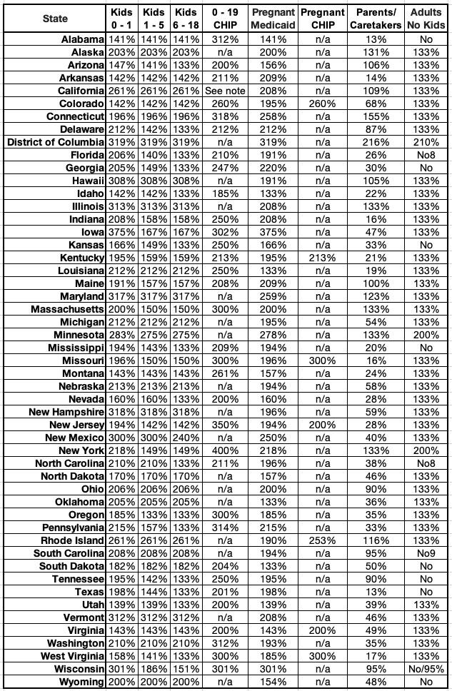 For example, in Arizona, newborns are eligible for Medicaid up to 147% FPL, but if they're age 1 - 5 they're only eligible up to 141%, and only 133% FPL for kids age 6 - 18. Pregnant women are, oddly, eligible up to 156% FPL, but non-pregnant parents are only eligible up to 106%...except that adults without minor children are eligible up to 133% FPL (actually 138% via a 5% income disregard).