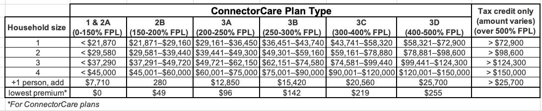 They also include a couple of tables breaking out the new income thresholds for various household sizes and which ConnectorCare plan each is eligible for: