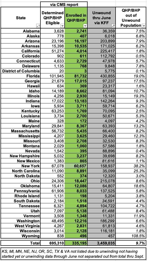 Unfortunately this doesn't tell me how many were actually disenrolled from Medicaid/CHIP, and the other report only runs through June. According to KFF's tracker, a total of 62,035 CT residents had been disenrolled via Unwinding through June, so the 2,729 QHP enrollees would have been just 4.4% of the total as of that point. It was up to 7,944 as of the end of August.