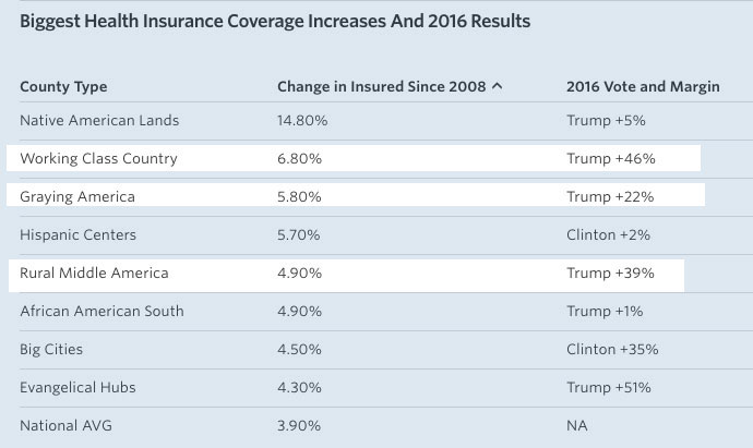 The Gallup data, analyzed with the county typology from the American Communities Project, show that eight county types have seen increases in health insurance coverage greater than the national average. Six of those types — representing about 77 million people or 33 million votes, a quarter of the total cast — sided with Mr. Trump, some by very large margins.