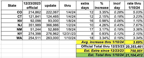 UPDATE: Here's another way of looking at it. There are 7 state-based exchanges where I have hard enrollment data since 12/23/23. On average these seven states suggest that overall enrollment has increased by around 3.7% since then, or around an additional 750K, and these states are only running about 20% higher year over year so far, well below the 33% national average. If they're remotely representative I could easily see the final total being 1.0M higher than today's press release or more.