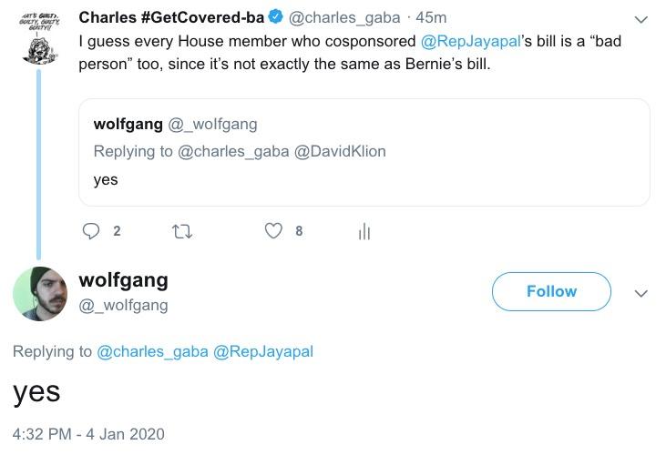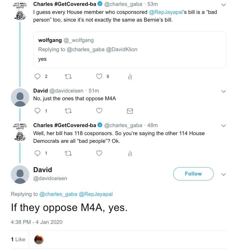 Yet according to at least one die-hard M4All advocate, House members who support the House version of Medicare for All are BAD PEOPLE...because they don't support the LESS PROGRESSIVE Senate version introduced by Bernie Sanders.
