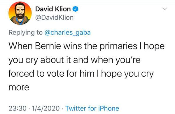 David Klion is the News Editor at JewishCurrents and a writer for The Nation and The New Republic. As you can imagine, he's a pretty left-wing/progressive kind of guy, and a devout Bernie Sanders supporter. He has a verified account (as I do) and has about 55,000 Twitter followers (compared to my 35,000, FWIW). In other words, both of us have small but respectable followings on social media and are what the powers that be would likely consider "low-level" (?) Twitter influencers.