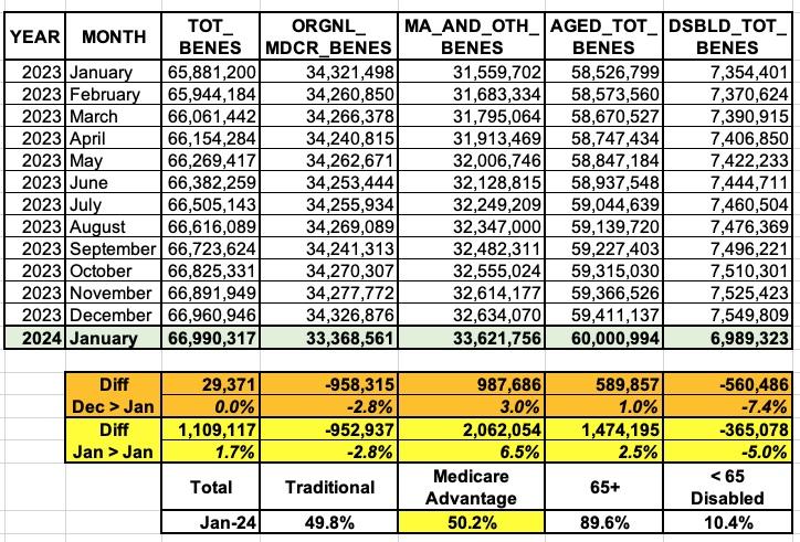 - Medicare Advantage beneficiaries reached 33,621,756...up an equally stunning 987,686.