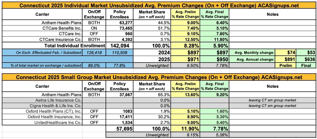 Connecticut: *Final* avg. Unsubsidized 2025 #ACA Rate Change: +5.9%; sm. group market continues to shrink (updated)