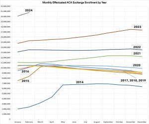 2023, in particular, saw a further surge in effectuated enrollments over the second half of the year due to the Medicaid Unwinding process kicking into gear, bringing millions of Medicaid enrollees over to ACA exchange plans.