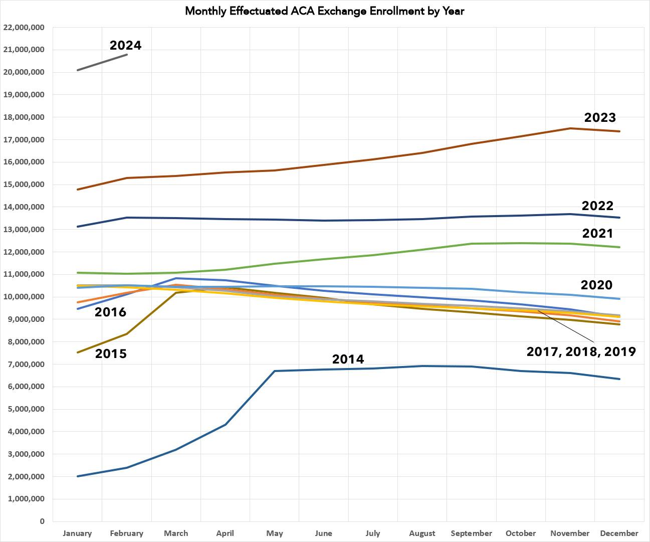 Finally, you can see 2024 in the top left corner. While we only have 2 months of data for this year so far, the effectuated enrollment numbers tower over every other previous year. It will be interesting to see how this plays out over the rest of the year, considering that the still-happening Unwinding process has mostly tapered off.