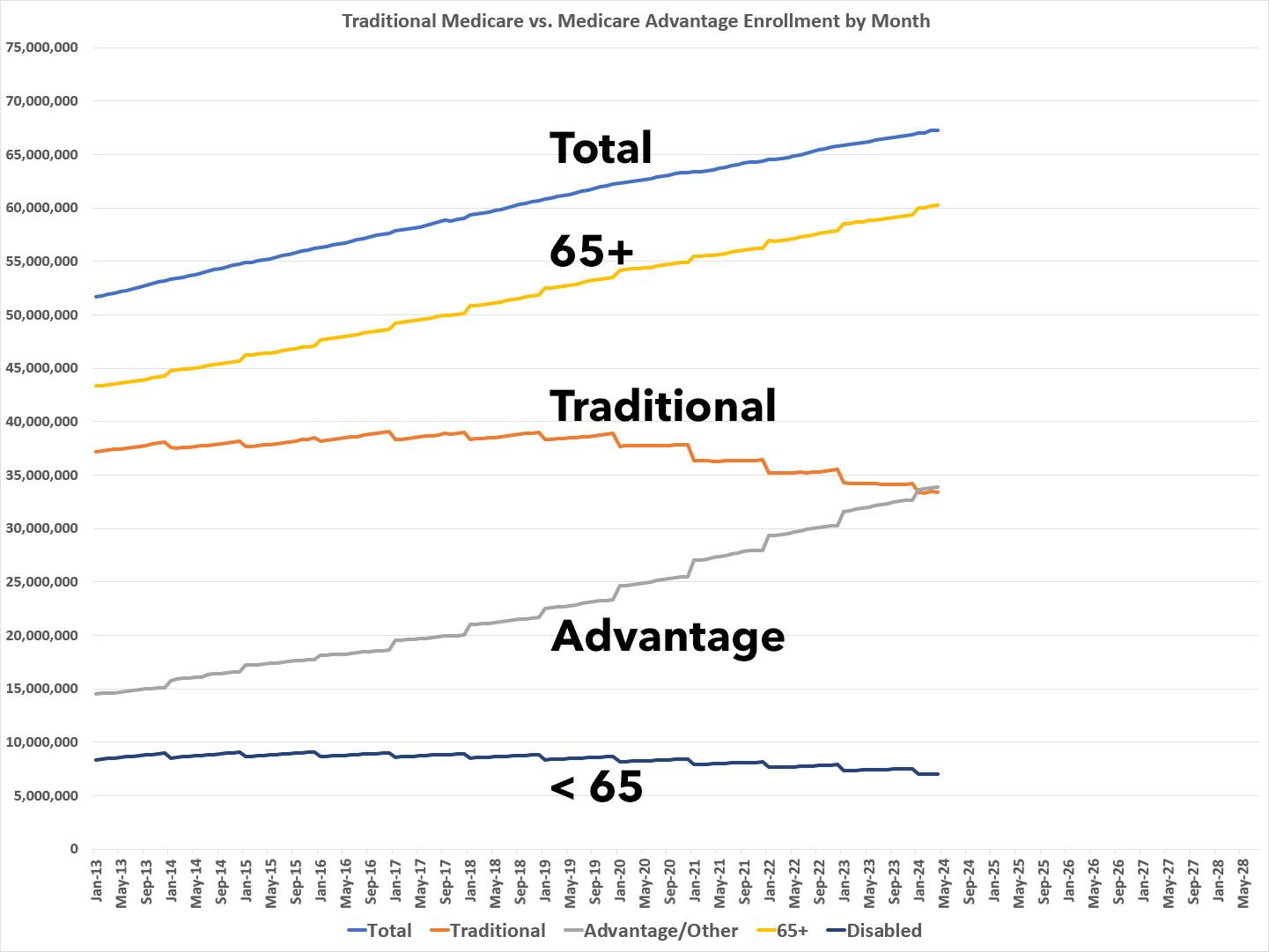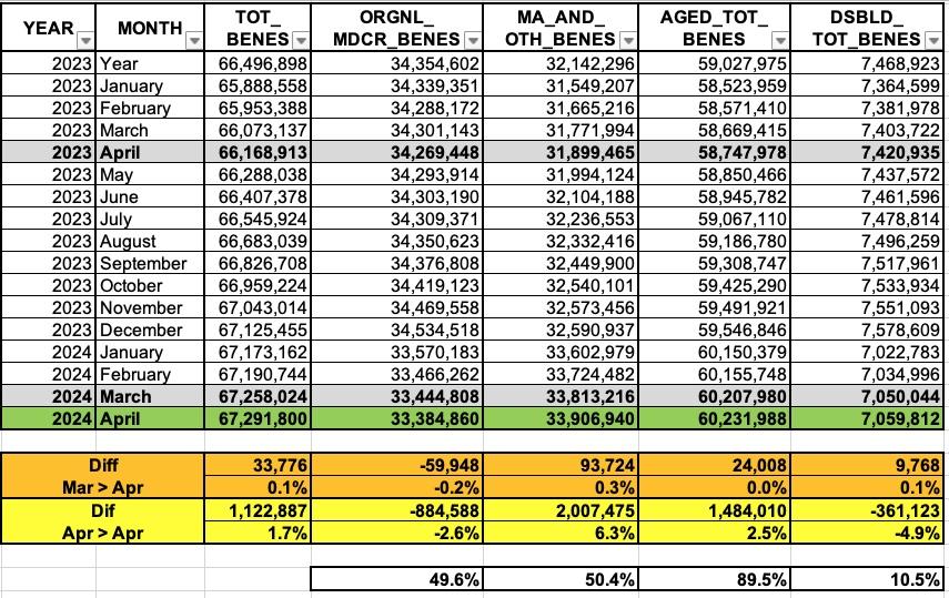 - Total Medicare beneficiaries reached 67,291,800...up just 33,776 from March