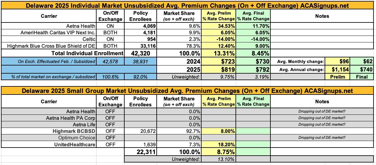 Delaware: *Final* avg. unsubsidized 2025 #ACA rate changes: +8.5% (updated)