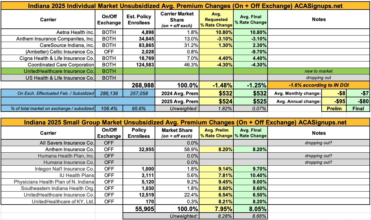Indiana: *Final* avg. unsubsidized 2025 #ACA rate changes: -1.3%; UHC joining, US Health & Life leaving (updated)