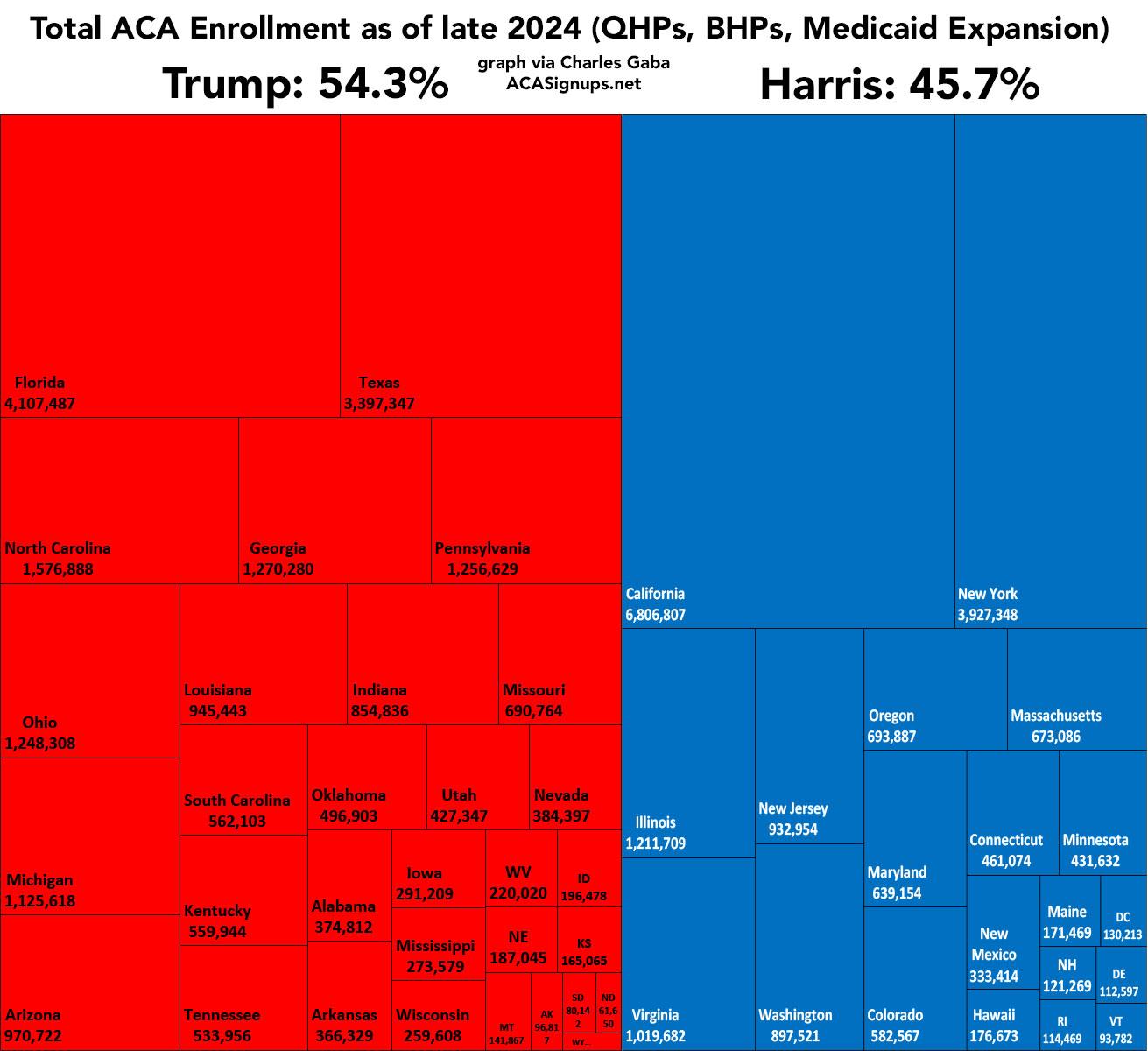 Update: Here's a more accurate representation of total ACA enrollment by state & Presidential election results as of late 2024, including exchange QHP enrollments, Basic Health Plan enrollments, and ACA Medicaid expansion enrollments.